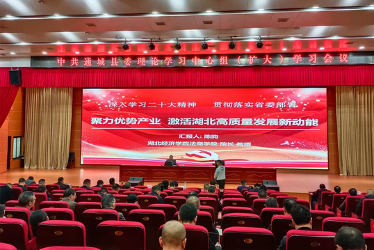 本网讯(通讯员 赵云飞)为深入学习贯彻党的二十大精神、习近平新时代中国特色社会主义思想及习近平总书记关于湖北工作的重要讲话和指示批示精神,解读省第十二次党代会精神、省两会精神、省流域综合治理和统筹发展规划纲要精神,3月9日,我院院长、中共湖北省委讲师团成员陈昀教授受邀赴通城县围绕《聚力优势产业,激活湖北高质量发展新动能》作专题辅导报告。通城县各级领导干部共170余人参加学习。